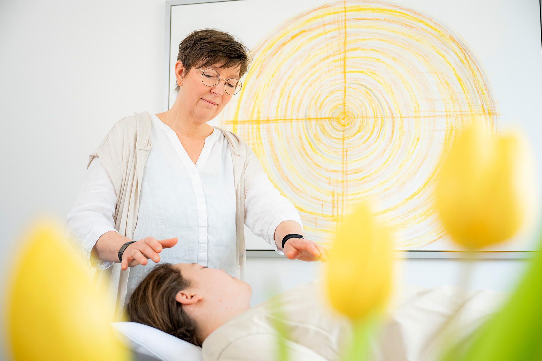Das achtsame Handauflegen ist eine sanfte und zugleich tiefgehende Anwendung. Durch die ruhige Präsenz und die die behutsame Berührung kann eine tiefe Entspannung entstehen. In dieser Stille darf der Körper loslassen. Gedanken kommen zur Ruhe, und es kann ein Gefühl von innerem Frieden entstehen.Sie müssen dabei nichts tun oder leisten. Sie liegen entweder bequem auf der Liege oder sitzen auf einem Stuhl. Die Berührung von außen kann dabei helfen, sich selber wieder zu spüren.Viele Menschen erleben während oder nach dem Handauflegen